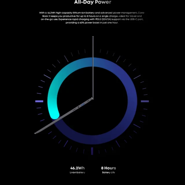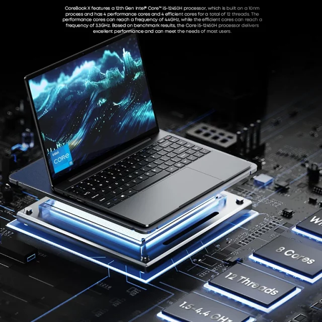 Equipped with the latest 12th Gen: Intel Core i5-12450H processor, the CoreBook X delivers faster performance up to 4.4GHz dual-core turbo frequency, giving you a smoother workflow, and saving time to develop more ideas.